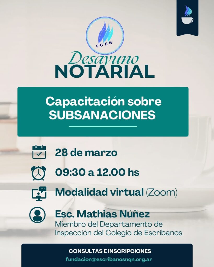 La Fundación del Colegio de Escribanos de la Provincia del Neuquén realizará el I Desayuno Notarial del año, que se llevará a cabo el 28 de marzo de 2026, de 9:30 a 12:00 horas, en modalidad virtual a través de la plataforma Zoom.